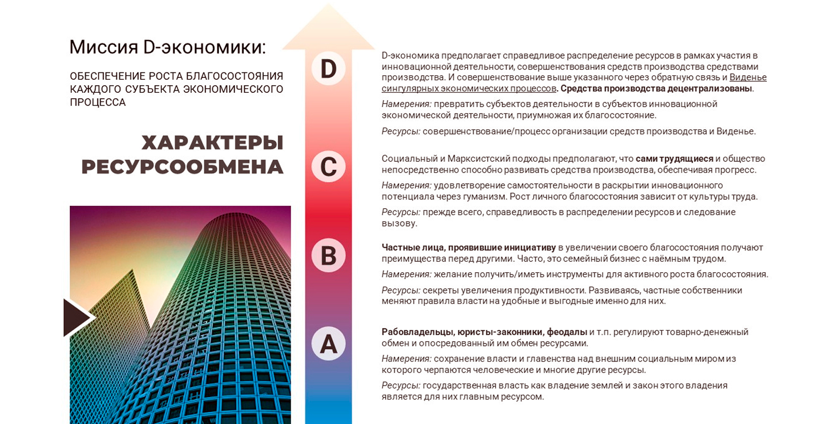 Для многих людей это может показаться фантастикой. Однако, мы утомились думать об этом в таком контексте. Мы создали, продолжаем разрабатывать/доказательно детализировать логичную, социально-ориентированную и весьма разумную модель "D-экономики".