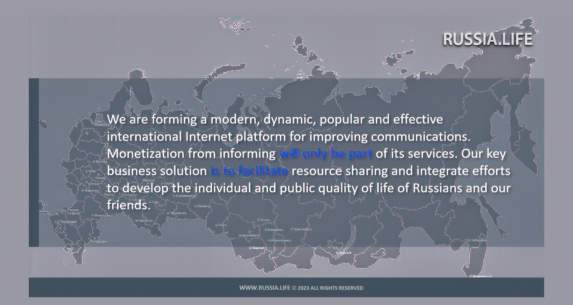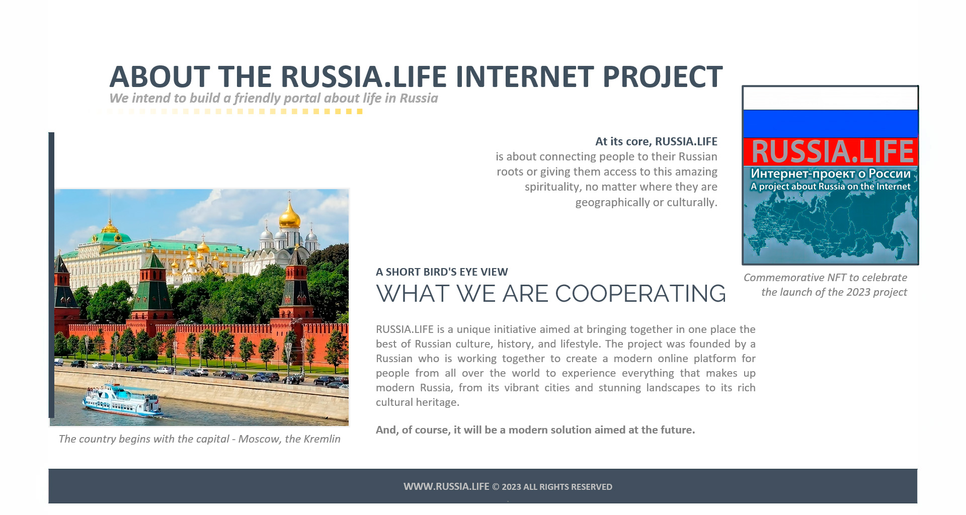 RUSSIA.LIFE is a modern internet project that showcases the diverse beauty and potential of Russia. We are developing an innovative online platform that brings together people from around the world to immerse themselves in the richness of our country's culture, history, and way of life. Our goal is to facilitate the exchange of resources, collaboration, and enhance the quality of life for all project participants and Russians.